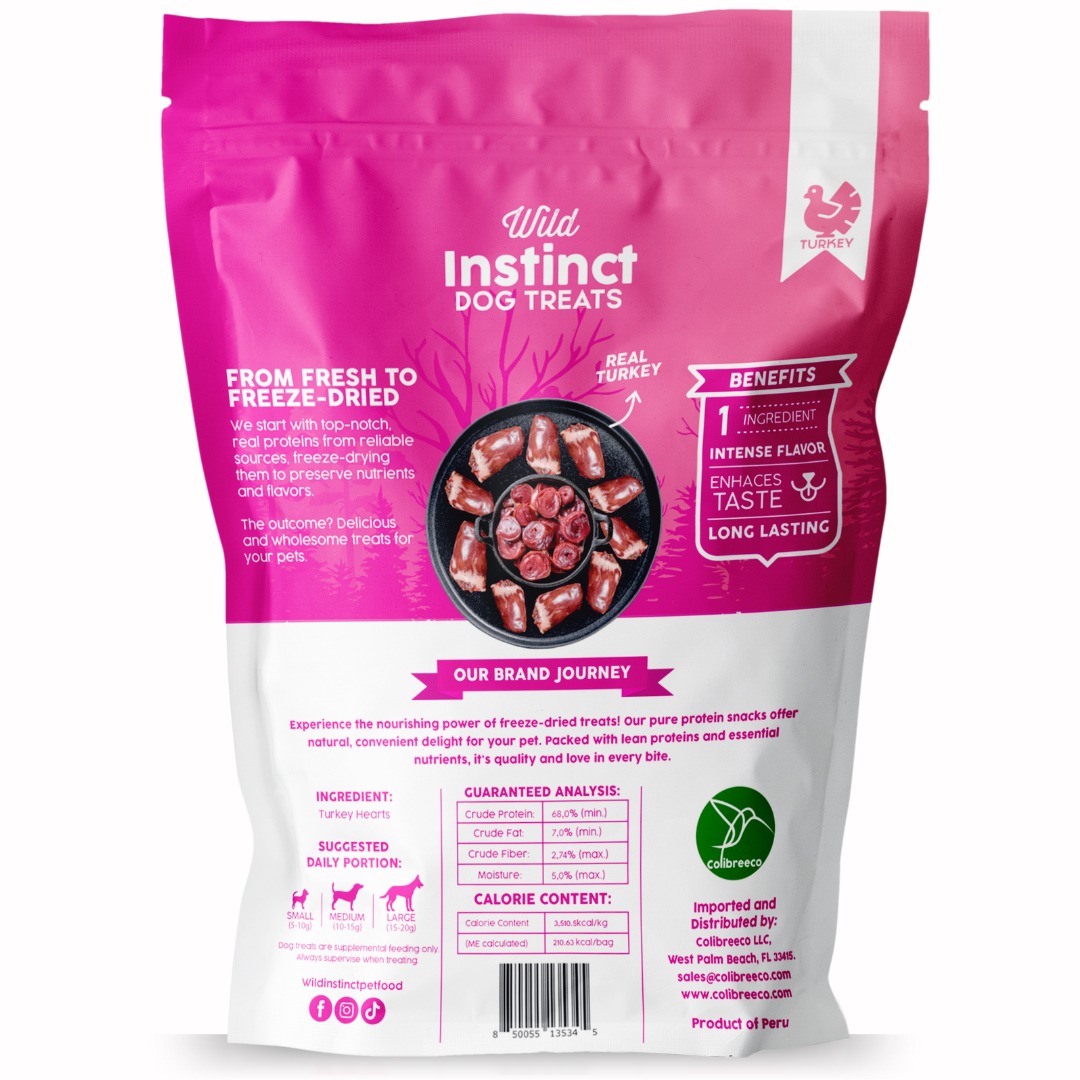 Wild Instinct dog treats freeze dried Turkey hearts prepared with a single ingredient and 100 % natural.